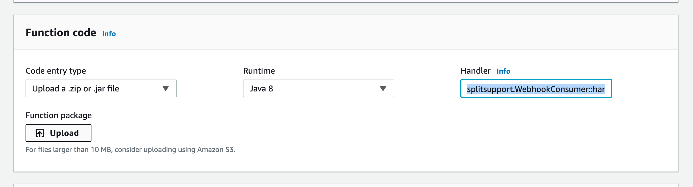 13. Back on the AWS Lambda page, under the Function code section, update the Handler box with the following: splitsupport.WebhookConsumer::handleRequest. Then, upload the JAR file you just created: